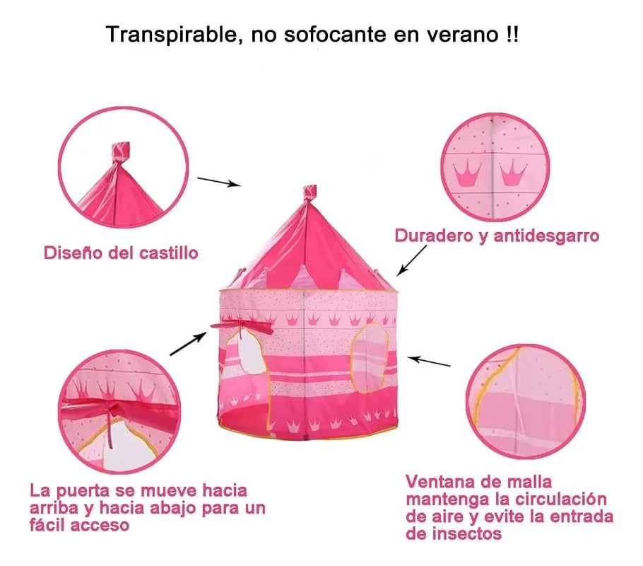 ¡Sí! El castillo es totalmente plegable y portátil. Se arma en menos de 5 minutos sin herramientas gracias a su estructura tipo pop-up. Se puede guardar fácilmente en su bolsa de transporte (incluida) y llevarlo a parques, patios, jardines o usarlo dentro de casa.